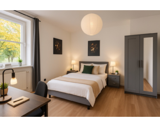 Die Wohngemeinschaft besteht aus drei hellen Einzelzimmern, einer gemeinsamen Küche und einem modernen Bad. Jedes Zimmer ist separat abschließbar und hochwertig möbliert (siehe Beispielzimmer) mit: