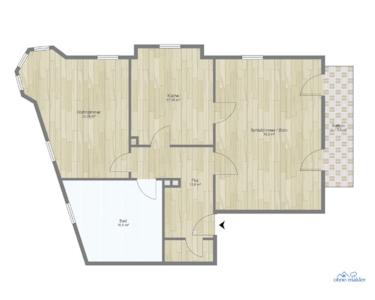 Es handelt sich um eine sehr großzügige 2 Zimmer-Wohnung. Eines der Zimmer ist so groß, dass es durch einen raumtrennenden Schiebtürschrank räumlich in praktisch 2 Zimmer getrennt ist (Schlaf- und Arbeitszimmer). Jetzt soll dieses große Zimmer (1,5 Zimmer) zusammen mit der großen Wohnküche, dem großen Badezimmer und den anderen Nutzflächen so wie eine WG zur alleinigen Nutzung vermietet werden. Wie ist das gemeint? Das 2. Zimmer (im Grundriss grün markiert) soll für eine Pflegekraft für meinen dementen Vater sicherheitshalber freigehalten werden, der zusammen mit meiner pflegenden Mutter in der Wohnung im Dachgeschoss wohnt. Die Wahrscheinlichkeit, dass jemals eine Pflegekraft dort einziehen wird, liegt bei 5%, da es genügend Wohnraum im DG bei meinen Eltern gibt. Es ist also eine reine Vorsichtsmaßnahme, das 2. Zimmer freizuhalten. Somit stehen dem Mieter volle 90 m² zur alleinigen Nutzung zur Verfügung und das 2. Zimmer bleibt verschlossen (nach Absprache ggf. ebenfalls nutzbar). Für den unwahrscheinlichen Fall einer Pflegekraft, würde es ein Zusammenleben wie in einer WG geben, dann aber natürlich zu reduzierten Kosten, da dann korrekterweise die 1,5 Zimmer mit "halbierter" Küchen-, Bad-, Flur- und Wirtschaftsraum-Fläche "nur noch" 66 m² wären!