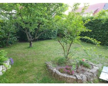 Der durch eine Buchenhecke begrenzte außergewöhnlich ruhige Garten bietet mit seinen 211m² genug Platz für die ganze Familie. Die mit altem Kopfsteinpflaster versehene Terrasse ist uneinsehbar und groß genug für einen Grillabend unter Freunden. Neben diversen Staudenrabatten gibt es überdies einen alten Apfelbaum. Zum Nachbargrundstück gibt es keinen Zaun, was die Großzügigkeit des Grundstücks unterstreicht. Weiterhin gibt es einen Geräte- und Fahrradschuppen.