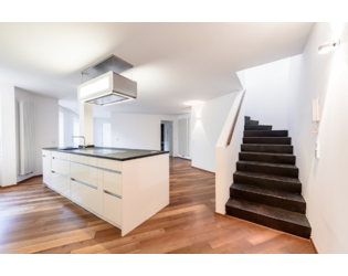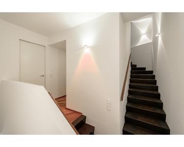 Im Erdgeschoss befindet sich eine flexibel nutzbare Einliegerwohnung mit eigenem Eingang, großem Küchenblock, Parkettboden sowie Bad mit Wanne – ideal als Gästebereich, Büro oder zur Vermietung. Selbstverständlich könnte diese Einheit mit den oberen Etagen verbunden werden. Nebenan befindet sich die Haustür und das Treppenhaus zu der oberen Wohneinheit. Der Eingangs- und Garderobenbereich beeindruckt mit klarer Architektur und einer markanten Stahltreppe, die ins Obergeschoss führt.