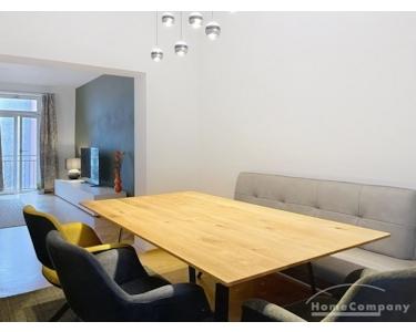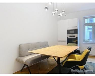 Der großzügige Wohn- und Essbereich bildet das Herzstück der Wohnung. Die moderne, voll ausgestattete Küche mit großem Essbereich ist offen zum Wohnzimmer gestaltet und schafft eine elegante, kommunikative Wohnatmosphäre. Das Wohnzimmer ist mit einer hochwertigen Ledercouch sowie TV ausgestattet und bietet direkten Zugang zum großen Balkon, der ruhig zum Hinterhof ausgerichtet ist.