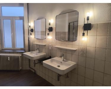 Das sehr große Vollbad hat teilweise neue Sanitärobjekte wie Doppel-Waschbecken, Glasduschkabine, ein neues WC sowie einen neuen Boden bekommen. Der Retro-Charme des Fliesenschildes und der Wannenanlage wurde mit neuen Spiegeln, Lampen und einigen Details im schwarzen Industrial-Chic aufgepeppt. Hier findet auch die Waschmaschine Platz.