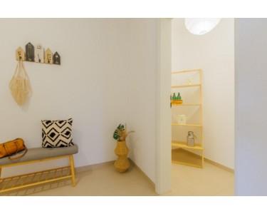 einen geräumigen Flur mit Garderobenbereich sowie ein helles Badezimmer.