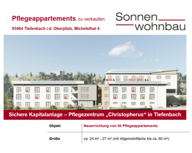 Im beschaulichen Tiefenbach entsteht zentrumsnah das Seniorenzentrum „Christopherus“, bestehend aus zwei getrennten Baukörpern. In einem Bauteil befinden sich Pflegeappartements. Das zweite Gebäude beinhaltet betreute Wohnungen sowie eine ambulant betreute Senioren-WG.