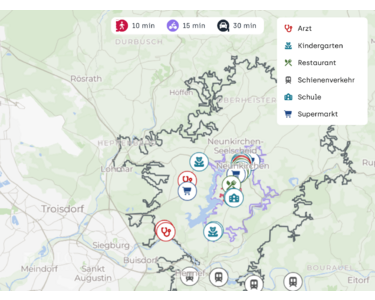 In der unmittelbaren Umgebung finden sich zahlreiche Einrichtungen für den täglichen Bedarf. Ein Lidl-Supermarkt ist in etwa 1,2 Kilometern erreichbar, während weitere Einkaufsmöglichkeiten wie ALDI Süd und Netto Marken-Discount in ca. 2,5 Kilometern Entfernung liegen. Für Familien mit Kindern ist die Nähe zu Bildungseinrichtungen besonders attraktiv. Die Grundschule Wolperath-Schönau ist nur etwa 450 Meter entfernt, und auch weiterführende Schulen wie das Antoniuskolleg und die Gesamtschule Neunkirchen sind in der Nähe.