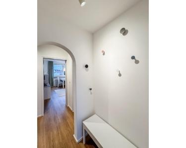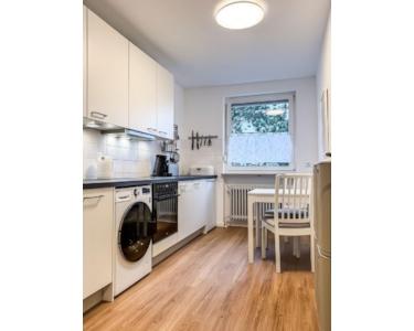 Die Wohnung besteht aus zwei voll möblierten Zimmern sowie einer großzügigen Küche, einem hellen Tageslicht-Badezimmer, einer Garderobe, einem Flur, einer Abstellkammer und verfügt über Geschirrspüler, Waschtrockner, zwei Kühlschränke und schnellem WLAN.