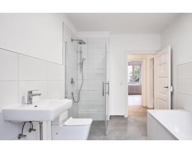 Die Wohnung hat einen breiten Flur, von dem Küche, Gäste-WC, Bad und alle Zimmer erreichbar sind. Eine große Küche, in der eine großzügige Einbauküche Platz findet und zudem Platz für einen Tisch mit 4-6 Stühlen bietet. Vor dem Gäste-WC ist Platz für eine Garderobe. Das große Bad ist neu gefliest mit einer Walk-In-Dusche, einer Badewanne einem zusätzlichen WC, einem großen Handwaschbecken und Platz für Waschmaschine und Trockner nebeneinander. Es gibt ein straßenseitiges Zimmer und zwei große Zimmer zum Hof. Es sind nur hochwertige Materialien u.a. für die Steckdosen und Schalter (Jung) Objekte (Duravit) und Objekte (Hans Grohe) verbaut.