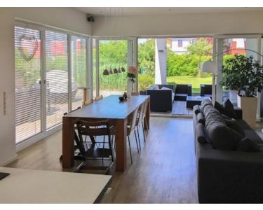Dieses moderne, freistehende Einfamilienhaus bietet ca. 187 m² Wohnfläche auf zwei Ebenen und wird mit einer Befristung von 17 Monaten vermietet. Der helle, offen gestaltete Wohn- und Essbereich mit Kamin öffnet sich zur großzügigen Terrasse und dem privaten Garten. Ergänzt wird das Raumangebot durch eine voll ausgestattete offene Küche mit Siemens-Geräten, ein Arbeitszimmer, einen Hauswirtschaftsraum mit