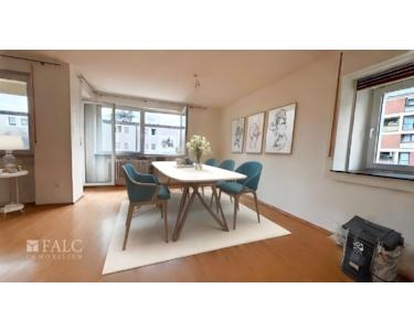 Der großzügige Wohn- und Essbereich öffnet sich zur sonnigen Loggia, von der aus Sie die Aussicht in die Ferne genießen können. Ein Platz zum Entspannen, Auftanken und Wohlfühlen – hoch über der Stadt.