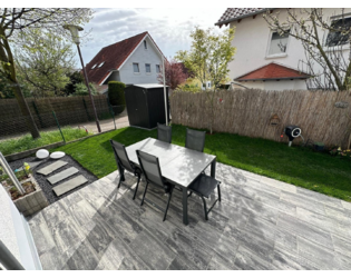 Vom Wohnbereich aus erreichen Sie die große Terrasse, die 2024 durch einen ortsansässigen Gala-Bauer hochwertig saniert wurde.