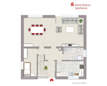 Erdgeschoss: Windfang mit Treppenaufgang ins Dachgeschoss, Flur, kombiniertes Wohn- und Esszimmer mit Terrassenzugang, Gästezimmer, Küche mit Einbauküche, Tageslichtbad mit Badewanne;