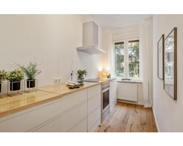 Die separate Küche ermöglicht entspanntes Kochen, ohne Gerüche im Wohnbereich. Der Balkon mit Blick ins Grüne rundet das Wohnkonzept ab und schafft einen ruhigen Rückzugsort mitten in der Stadt.