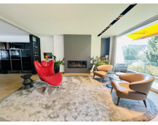 Der repräsentative Wohnbereich mit Kaminzimmer und einer modernen Designerküche von Poggenpohl (Porsche Design) ist funktional und zugleich elegant gestaltet. Großzügige, bodentiefe Fensterfronten öffnen den Raum zur sonnigen Süd-West-Terrasse. Ergänzt wird diese Ebene durch eine großzügige Eingangsdiele mit Garderobe, ein Gäste-WC sowie einen praktischen Wirtschaftsraum/ Anschlussraum.