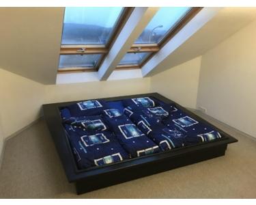Fantastisches Futon Bett 200x200cm, direkt unter Dachfenster. Bettwäsche, Decke (zwei Stück 220x140cm) und Kissen. Ein großer Spiegelschrank fungiert als Raumteiler zum Bürobereich. Schreibtisch, Rollcontainer und Bürosessel.