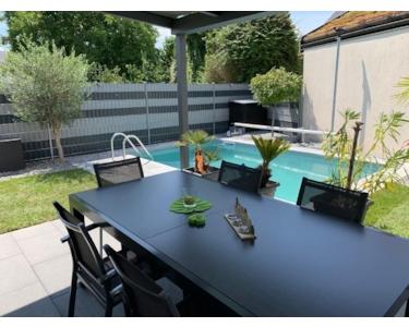 4,5 Zimmer, 1 Badezimmer mit Badewanne und Dusche, Gäste-WC, Terrasse, Garten, Garage (10m) und 3 Stellplätze. Fußbodenheizung im EG und Badezimmer mit zusätzlichem Handtuchheizkörper, weiße Innentüren, Gasheizung und Solar für Warmwasser, Photovoltaikanlage mit Speicher, Alarmanlage, 3-fach verglaste Kunststofffenster weiß mit abschließbaren Fenstergriffen, Fenster teils mit Fliegengitter, elektrisch betriebene Rollläden mit separater Funk-Fernbedienung, Klimaanlage in allen Schlafräumen, Einbauküche von Plana mit Granitarbeitsplatte und Einbaugeräten der Marke Siemens, Abstellraum mit Einbauschränken vom Schreiner angefertigt, Videosprechanlage im EG/OG, Überdachte Terrasse mit integriertem Sonnenschutz und Beleuchtung, Garten komplett eingezäunt mit Bewässerungsanlage, Beleuchtung am Zaun und im Boden, sowie Strahler mit Bewegungsmelder, Außenkamera und Zugang über ein seitliches Gartentor. Pool mit Wärmepumpe, Jacuzzi, Gartendusche mit Warmwasseranschluss.
