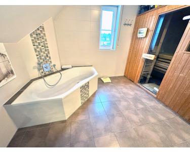 Obergeschoss: Elternschlafzimmer mit Balkonzugang und Bad "en Suite" (mit Sauna, ebenerdiger Dusche, WC, Bidet, Waschtisch und Wanne), Kinderzimmer I, Diele, Kinderbad (mit WC, Dusche und Waschtisch), Hauswirtschaftsraum