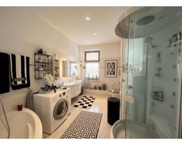 Ebenfalls auf dieser Seite befinden sich ein weiteres Schlafzimmer sowie das hochwertige Tageslichtbad, das mit viel Hingabe modernisiert wurde. Hochwertige Markenmöbel, eine komfortable Eckbadewanne und ein großzügiger Duschbereich machen diesen Raum zu einer echten Wohlfühloase.