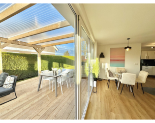 Die rund 81 m² Wohnfläche sind optimal aufgeteilt: Ein heller Wohn- und Essbereich mit großflächigen Fenstern öffnet sich direkt zur überdachten Terrasse. Die offene Küche schafft fließende Übergänge und eine moderne Wohnatmosphäre. Für gemütliche Abende sorgt ein Kamin, der Wärme und Atmosphäre verbindet.