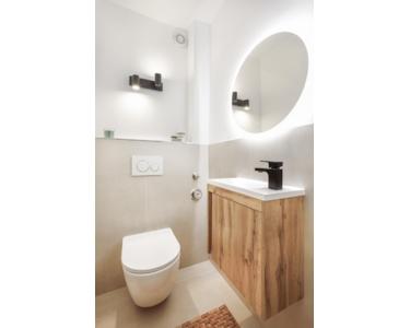• Armaturen: Hochwertige, in Schwarz gehaltene Armaturen und Bad-Accessoires (sichtbar in den Bildern).