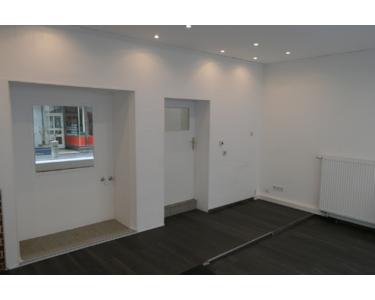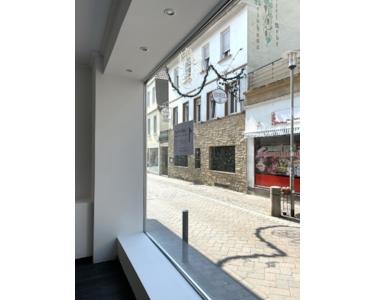 Das Erdgeschoss besitzt zwei Gewerbeeinheiten inklusive Garage. Die beiden großen Schaufenster zum verkehrsberuhigten Bereich (Einbahnstraße) durchfluten die beiden Läden mit reichlich Tageslicht. Die kleinere Ladeneinheit erstreckt sich über ca. 40m² und die größere Ladeneinheit über ca. 90m². Die angrenzende Garage gehört zur größeren Ladeneinheit (Verbindungstür vorhanden) und ist von einer rückseitigen Lieferstraße zu erreichen.