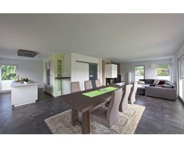 Zentraler Punkt der Villa ist die mittig platzierte Treppe, die den offenen Wohn- und Essbereich geschickt vom Kochbereich trennt. Die lichtdurchfluteten 45 m² bieten Raum zum Wohnen, Essen und Kochen und schaffen eine Atmosphäre voller Lebensfreude. Direkt neben der Küche befindet sich eine nützliche Speisekammer, während in einer separaten Nische Platz für eine Garderobe geschaffen wurde, um Jacken und Schuhe zu verstauen. Der großzügige Wohnbereich verfügt zudem über zwei Terrassentüren und bietet genügend Platz, um bei Bedarf eine zusätzliche Wand einzufügen, damit das Wohnen auf einer Ebene möglich wird - ideal für altersgerechtes Wohnen oder im Krankheitsfall. Ergänzt wird das Erdgeschoss durch ein Badezimmer sowie einen Hauswirtschaftsraum.