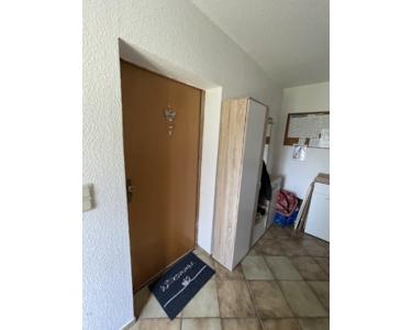Hier hat man links den Eingang für das Appartement mit offen gestalteter Küche und Duschbad.