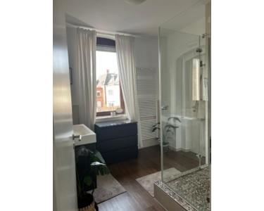 Durch das stilvoll modernisierte Badezimmer mit Tageslicht und Dusche gelangt man zu einem kleinen Abstellraum, ebenfalls mit Fenster, in dem sich perfekt eine Waschmaschine, Trockner, Staubsauger und Co. verstauen lassen. Ebenfalls modernisiert ist das kleine aber feine separate WC.