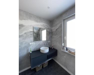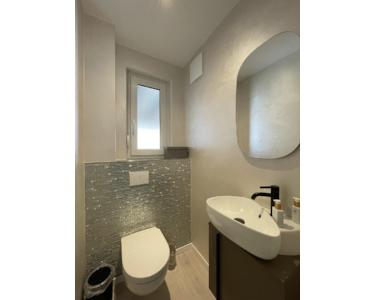 Das Gäste-WC mit Fenster, Designer Waschbecken mit einem Unterschrank wurde hochwertig mit edler Seidentechnik verputzt.