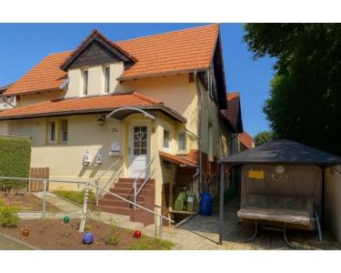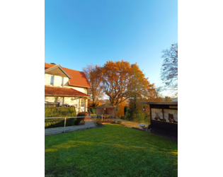 Rechtlich handelt es sich um eine Erdgeschosswohnung, praktisch wohnen Sie wie in einer Doppelhaushälfte mit separatem Eingang und eigenem Garten. Im Erdgeschoss befinden sich Küche, Wohnzimmer und Bad, im Obergeschoss zwei Schlafzimmer. Im Keller ist eine einfache Duschkabine vorhanden.
