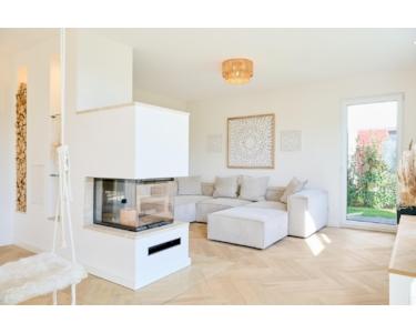 Direkt anschließend präsentiert sich die stylische Küche mit Kochinsel und einer edlen Arbeitsfläche aus Travertinstein, sowie hochwertigen Markengeräten. Der stilvolle Panoramakamin bildet das Herzstück zwischen Ess- und Wohnbereich und sorgt für eine gemütliche Atmosphäre.