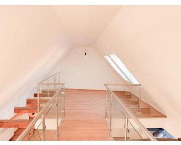 Die Wohnung ist mit einer Empore verbunden, die über eine Holztreppe vom Wohnzimmer aus erreichbar ist und mit einer Glasbalustrade umfasst wurde. Sie verfügt über insgesamt vier Zimmer, die flexibel als Schlafzimmer, Büro oder Gästezimmer genutzt werden können. Damit eignet sich das Objekt ideal für Familien, Paare mit Homeoffice-Bedarf oder Menschen, die Wert auf viel Raum und besondere Architektur legen.