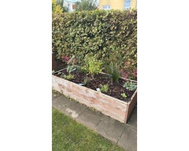 Zwei Hochbeete bieten zusätzlich Raum für Hobbygärtner und ermöglichen es, den eigenen grünen Daumen auszuleben, ohne dass ein hoher Pflegeaufwand entsteht.