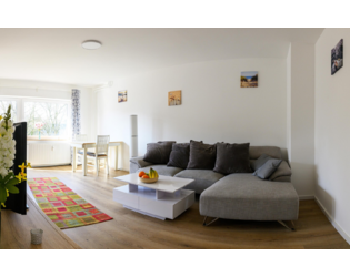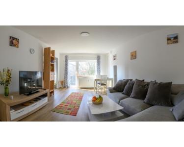 In der neuwertigen Küche mit edler Farbgebung befindet sich neben einem Geschirrspüler und einem Backofen mit Elektroherd außerdem ein Kühlschrank, eine Edelstahl-Spüle, eine Kaffeemaschine, ein Toaster sowie moderne Hängeschränke, die zusätzlichen Stauraum bieten. Das großzügige und helle Wohnzimmer sorgt durch den hohen Lichteinfall über die großen Fenster für eine besonders freundliche Atmosphäre und wird mit dem Zugang zum Balkon mit Westausrichtung und Blick ins Grüne abgerundet.
