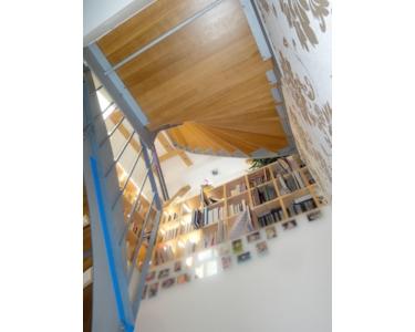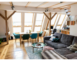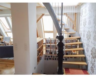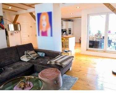 Über den Flur und die innen gelegene Wendeltreppe gelangt man in den großzügigen Wohnraum im Dachgeschoss. Dieser besticht durch Helligkeit und eine an den offenen Wohnraum angrenzende Küche. Ebenfalls befinden sich im Dachgeschoss ein Gästezimmer