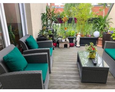 Eine Terrasse auf dieser Ebene sowie eine zusätzliche Dachterrasse (durch elektrisch bedienbare Luke über innenliegende Treppe zu erreichen) mit Blick über die Dächer von Berlin bieten großzügigen Raum zum Entspannen.