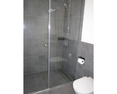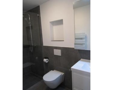 - Bad mit ebenerdiger Regendusche mit Glasduschwand Walk-In), Waschtisch mit Spiegelschrank, WC und zusätzlichem elektr. Handtuchheizkörper