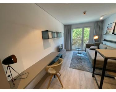 Es ist sehr modern ausgestattet mit Fußbodenheizung und separater Schreibecke sowie Geschirrspüler und Flachbild-TV. Die Küche ist mit einer Grundausstattung an Geschirr und Besteck ausgestattet. Außerdem werden im Haus viele Annehmlichkeiten wie Dachterrasse, Leseecken, Fitnessstudio, Rezeptionsservice u.v.m. geboten.