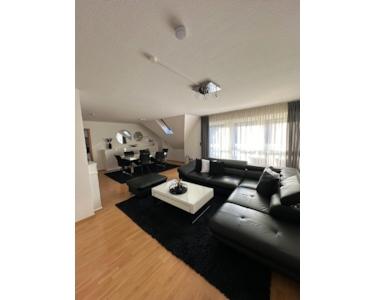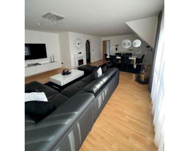 Im unteren Bereich der Wohnung erwarten Sie ein großes Wohnzimmer mit Essbereich, die separate Küche, ein Flur sowie ein Gäste-WC. Vom Wohnzimmer aus gelangen Sie auf den großen Südbalkon, der zu gemütlichen Stunden im Freien einlädt. Im Spitzboden befinden sich zwei Schlafzimmer sowie das moderne Badezimmer mit großer Badewanne, separater Dusche und hochwertigen Natursteinablagen.