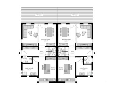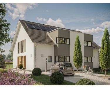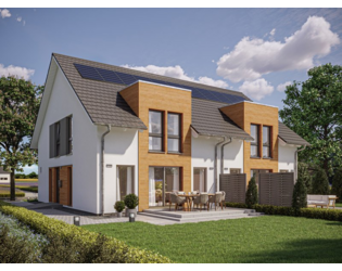 Der repräsentative Doppelhausentwurf mit Satteldach ist mit einem Zwerchgiebel mit Flachdach und einem Erker mit Flachdach geplant und ist deshalb sehr besonders. Die Küche liegt an der Frontseite des Hauses, bietet Fenster übereck und die Möglichkeit, einen Kochtisch in der Mitte der Küche zu platzieren.