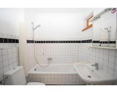 Das Bad hat einen Fliesenboden, der Rest der Wohnung ist mit hochwertigem Laminat-Fußboden ausgestattet.