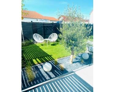 - Garten: Voll umzäuntes Grundstück mit Rollrasen, Sonnensegel mit Masten und ca. 40 m² gefliester Terrasse.. Sichtschutz durch Sichtschutzzaun sowie Hecke.