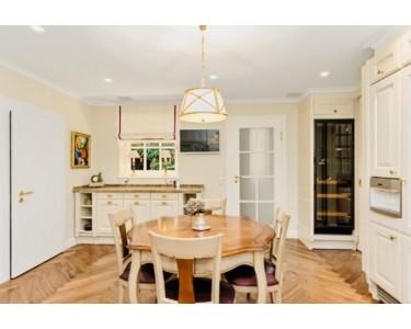 Edle Parkettböden, elegante Holzsprossenfenster, eine imposante Eingangshalle mit Galerie, ein Marmorkamin sowie vom Tischler gefertigte Einbauschränke in Küche, Flur, Bibliothek und Ankleide prägen das hochwertige Ambiente. Eine Küche mit Topausstattung, elegante Bäder sowie ein Wellnessbereich mit Pool und Sauna erfüllen höchste Ansprüche und verleihen dem Haus eine besondere Wohnatmosphäre.