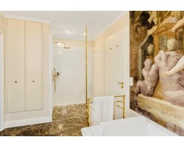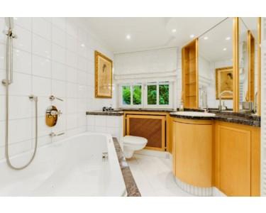 Im Dachgeschoss befinden sich sechs Wohn- und Schlafzimmer, die dank Größe, Schnitt und Helligkeit flexibel nutzbar sind, sowie drei Tageslichtbäder. Highlight ist das opulent ausgestattete Hauptschlafzimmer (31,52 m²) mit Loggia und Gartenblick, separater Ankleide (13,25 m²) mit Einbauschränken und einem Bad en suite mit Marmorboden, Dornbracht-Armaturen, Wanne, separater Dusche und Doppelwaschbecken. Das WC mit Waschbecken ist in einem separaten Nebenraum untergebracht.