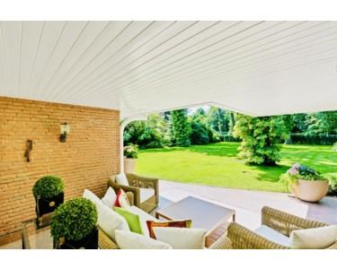 Ein weiteres Highlight ist der Außenbereich mit überdachter Terrasse und freiem Blick ins Grüne, Blumenarrangements, großen Rasenflächen zum Flanieren oder Spielen sowie prächtigem Baum- und Buschbestand als Sichtschutz – ruhig und privat gelegen, stets gepflegt, ideal zum Entspannen, immer!.