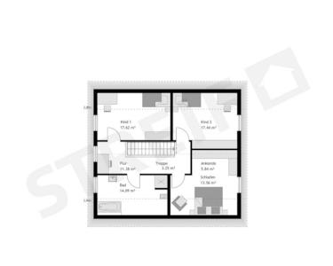 Im Dachgeschoss des Hauses sind zwei schöne Kinderzimmer, ein Elternschlafzimmer, ein Flur und ein Familienbad untergebracht. Die Lage der Treppe und des Haustechnikraumes sind fixiert.