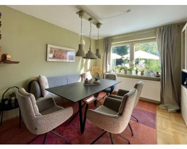 Die Ausstattung des Hauses ist hochwertig und gepflegt: In den Wohnräumen liegt Eichenparkett, die Bäder, der Eingangsbereich sowie die Hauswirtschaftsräume sind mit pflegeleichten Fliesen versehen, die Schlafzimmer teilweise mit Teppichboden. Das Haus verfügt überwiegend über Holzfenster mit Zweifachverglasung. Zusätzliche Sicherheit bieten die Fenster im Erd- und Untergeschoss, die mit Sicherheitsglas ausgestattet sind. Die Beschattung im Wintergarten erfolgt über ein automatisches oder manuell steuerbares Außenbeschattungssystem, in den übrigen Räumen über elektrische Rollläden.