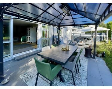 Terrassen: Gartenterrasse (EG) 52 m², Dachterrasse 48 m², Terrasse UG 15 m², teils überdacht mit Pavillon