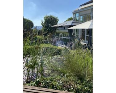 Die Außenterrassen sind mit anthrazitfarbenen Fliesen (2021) ausgestattet. Das Grundstück ist sehr gepflegt: Die Grünflächen sind angelegt, die Gartenzäune erneuert. Die Bewässerung erfolgt über ein smart gesteuertes System und der Rasen wird größtenteils von einem Mähroboter gemäht. Ein kleiner Teich, eine Außendusche, eine Holzhütte, ein Holzlager sowie der massive, überdachte Pavillonbereich auf der Terrasse runden das Angebot ab. Zudem sind rund ums Haus Wasser- und Stromanschlüsse vorhanden, die die Gartenpflege erleichtern.