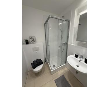 Das Badezimmer ist modern gestaltet und verfügt über eine Dusche. Handtücher sowie die grundlegende Badezimmereinrichtung stehen zur Verfügung.