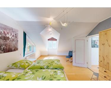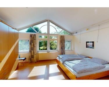 Eine eindrucksvolle achteckig ausgeformte Treppe aus massivem Ahornholz führt ins Obergeschoss, das sich durch hohe Decken und angenehme Lichtverhältnisse auszeichnet. Drei Schlafzimmer bieten ausreichend Rückzugsraum für die ganze Familie. Das Hauptschlafzimmer verfügt über eine Deckenhöhe von bis zu 4,20 m und bietet durch große Fensterflächen einen unverbauten Blick ins Grüne. Optional läßt sich dieses Zimmer auch durch eine Trennwand in zwei Kinderzimmer trennen. Das großzügige Wannenbad ist ebenfalls bis in den Giebel geöffnet und bietet durch die Kombination aus Fußbodenheizung, Wandheizkörper und hochwertigen Armaturen (Dornbracht, Platin-Ausführung) ein modernes, komfortables Raumgefühl. Zusätzlich steht noch ein kleines Duschbad zur Verfügung. Die Fenster im Obergeschoss wurden 2021 am Südwestgiebel mit einer neuen 3-fach-Verglasung ausgestattet.